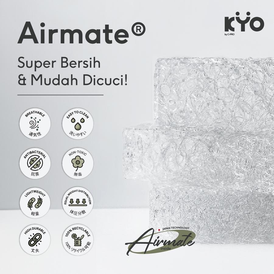 Seluruh produk KYO menggunakan Airmate, inovasi terbaru dari Jepang. Alternatif dari Foam dan Latex, berbentuk untaian tiga dimensi yang 90%-nya adalah udara. Airmate merupakan SATU-SATUNYA material yang dapat dicuci sehingga menjadikan Airmate sebagai alternatif yang TERAMAN dan TERBERSIH di DUNIA.